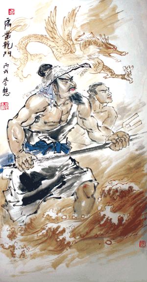 禹王凿龙门的时候,兵强将勇,有两个人曾经帮助禹王治水,一个叫后羿一个叫寒浞,后羿是有穷氏酋长。传统戏里有一出《嫦娥奔月》演的是嫦娥偷吃了她丈夫的仙药,飞升到了月宫。嫦娥的丈夫就是后羿。后羿的两只眼睛特大,别人看不见的东西他能看见,力大无穷,箭射得好。古时侯天上有十个日头,烤的地下水干土焦,百草不生,老百姓煎熬难挨,没法活下去,求后羿帮忙,后羿弯弓搭箭,一连射落九个太阳,从此人间才有了白天黑夜,春夏秋冬。后羿帮助禹凿龙门,用他那神箭,射山山开,射石石穿,为民工们引导方向,尽管山厚石硬,后羿总是一马当先,箭无虚发。另一个人叫寒浞。这个人粗胳膊壮腿,身高力大,能够在陆地上把水里行的船拉上走。他帮助禹凿龙门时,骑一只大龟,寒浞用鞭子打一下,乌龟往山上撞一下,撞一下山倒一峰,禹凿开了龙门,后人在追念禹王功绩,盖禹庙时,庙前廊下左右两个站神,就是后羿和寒浞。