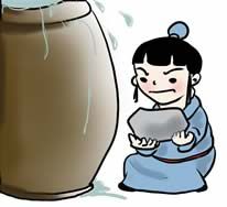 有一次,他跟小伙伴们在后院里玩耍。院子里有一口大水缸,有个小孩爬到缸沿上玩,一不小心,掉到缸里。缸大水深,眼看那孩子快要没顶了。别的孩子们一见出了事,吓得边哭边喊,跑到外面向大人求救。司马光却急中生智,从地上捡起一块大石头,使劲向水缸砸去,"砰!"水缸破了,缸里的水流了出来,被淹在水里的小孩也得救了。