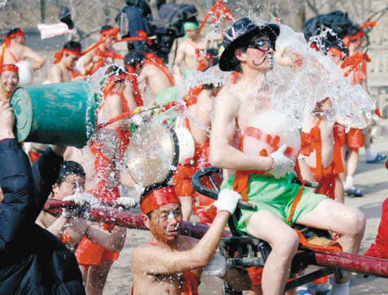 在永济县最南端的首阳山上,有一个长旺村。这里除了有伯夷、叔齐饿死遗址而驰名外,还有一个引人注目的民间风俗:每年春节,不论是大雪铺地,还是寒风刺骨,青年小伙子们总要裸胸露背,背冰一块,敲锣打鼓,游街串巷,显示雄风。民间把这种活动叫做“亮膘”。