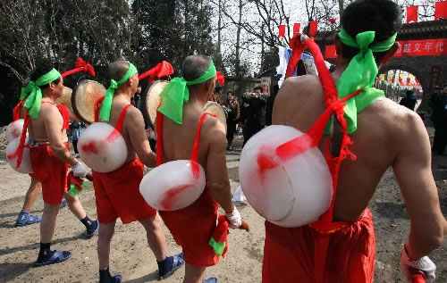 “背冰亮膘”为民间俗称,最早的“背冰”是民间祭祀举行的一种仪式活动,已沿袭1800多年。据考证,背冰活动始于东汉光武帝年间,民间传说那时黄河泛滥成灾,幸得东岳大帝显灵而使水退,民众因此建庙纪念,每年二月二日祭祀,背冰是祭祀中的一项仪式。后经世代沿袭发展,规模形式及活动时间都发生了很大变化。在今天晋南运城地区的永济县、芮城县境内,每逢正月十五,这种活动就加入了“闹红火”的行列之中。“背冰亮膘”是由一百零八个汉子组成,身着短裤,头裹红巾,手敲铜锣,光着脊梁背着从黄河里刚刚凿起的大冰块,仿效古代军事八卦阵的队形,踏着鼓点,并不断地变换队形威武地走在街上。随行其后的表演阵容进行着“赶毛驴上会”、“三打白骨精”等各种表演。据说,凡是参加“背冰亮膘”活动的人,一年四季都不会生病。但“背冰亮膘”也是对黄河汉子体质、力量、意志力的严峻考验。最早在脖子上套一个冰圈,在锣鼓声中昂然挺立,以显示不畏严寒的坚强气魄,后变化为背侧刀和赤身背大块冰凌绕村而行。背冰的汉子们都裸露着强健的肌肉,溶化了的冰水顺着他们的躯体直往下滴,可汉子们依然雄赳赳,气昂昂,形成一道惊心动魄的健与美的风景,故人们又称“炼铁骨”。