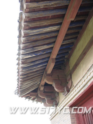 庙后条山葱翠,古堞峥嵘;庙前泉涌成溪,林木苍郁,这便是供奉龙泉之神“广仁王”的庙宇——广仁王庙。又因五龙泉水从庙基前涌出的缘故,当地群众也俗称其为“五龙庙”。五龙庙由正殿、戏台、厢房组成,四周有围墙,东南角辟有小门。正殿座北向南,为唐大和五年(831)建造,五开间四架椽进深三间,平面呈长方形,单檐歇山顶,柱头斗拱为五铺双抄偷心造,各种斗欹部的幽度极深,拱瓣棱角显明,内部搁架铺作斗拱硕大,叉手长壮,侏儒柱细短,构成极平缓的厦坡,只有五台山南禅寺可相比拟。殿内无柱,梁架全部露明。整个建筑结构简练,古朴雄浑,显示了唐代建筑风格。
