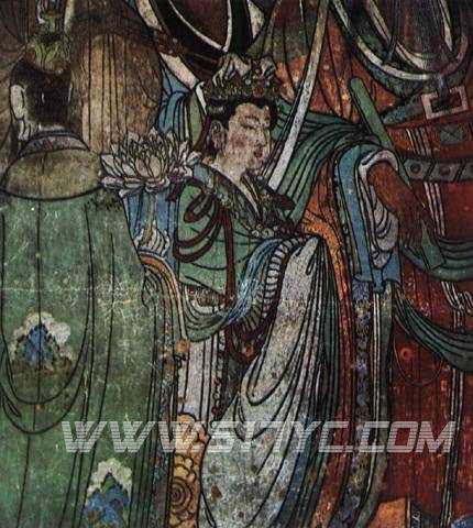 壁画中的神像虽然高度、朝向大致一样,但画面利用了不同的面部颜色、衣着和神态去表达不同神仙的身分、性格、帝君的神情多半比较肃穆;武将则全身披甲,鬓发飞扬;玉女则含情地微笑,有的在对话,有的在沉思,也有些在凝神、在顾盼,形象各具特色。每个神像大都只是寥寥几笔,以浓淡粗细的长线变化,就充分表现出质感的动势来。袍服、衣带上的细长线条,更多的是刚劲而畅顺地[一笔过]画上去,好像一条条钢线镶在壁画上一样,造就了迎风飞动的飘忽感,加强了画中仙人的生动性。这种画法不但承继了唐、宋以后盛行的吴道子[吴带当风]的传统,而且准确地表现了衣纹转折及肢体运动的关系,难度极高。