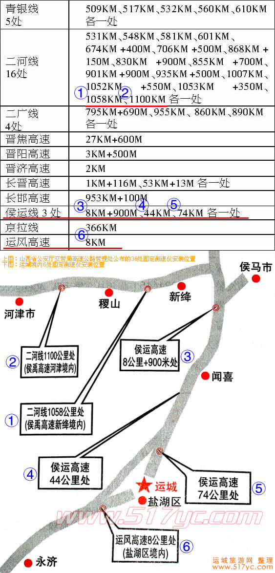 运城境内高速公路6处固定测速点位置,请看下图: