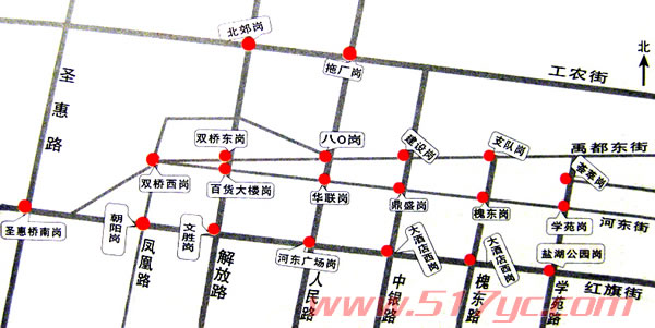 盐湖区交警部门公布的20个固定“电子眼”设置地点,都集中在各条街道十字路口,分别是:北郊岗、拖厂岗、八O岗、建设岗、支队岗、荟萃岗、学院岗、槐东岗、鼎盛岗、华联岗、百货大楼岗、双桥路东岗、双桥路西岗、朝阳岗、文胜岗、河东广场岗、圣惠桥南岗、盐湖公园岗。具体位置请看下面示意图: